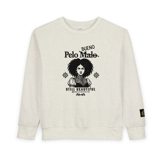 Toddler Sweatshirt — 'Pelo malo' Crossed Out to 'Bueno' with 'Still Beautiful' Curly Girl Design