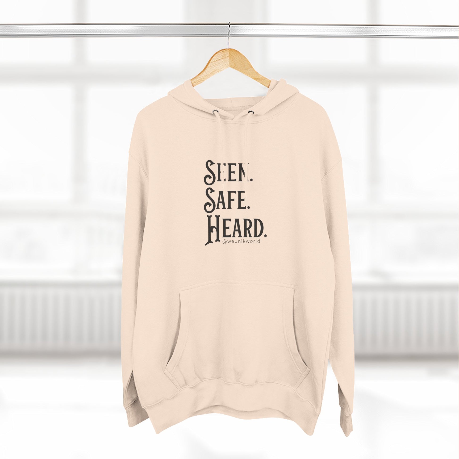 Seen. Safe. Heard Fleece Hoodie — Three-Panel Cozy Sweatshirt